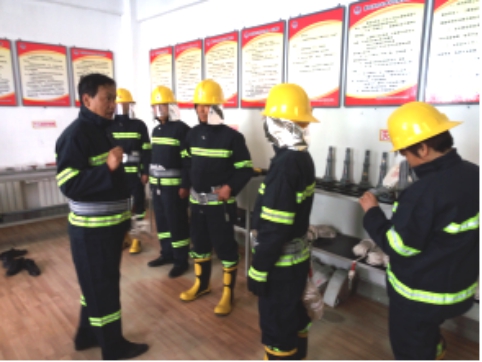 现场演示微型消防站防护用具的穿戴及使用方法,进一步细化了灭火战斗组、救援组各所属人员的责任分工,并对各类防护、逃生、破拆工具的实际用途做了详细的讲解说明。
