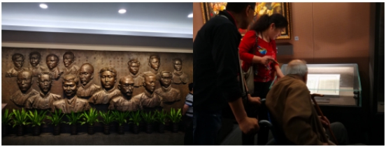 走进"一大"会址,首先映入眼帘的是13位中共代表及2位共产国际代表铜头像。他们是毛泽东、何叔衡、董必武、陈潭秋、王尽美、邓恩铭、李达、李汉俊、张国焘、刘仁静、陈公博、周佛海、包惠僧及荷兰人马林和俄罗斯人尼柯尔斯基,左手边是巨幅党旗,重温入党誓词,激情澎湃,激荡回响。忽然,我看见一位老人坐着轮椅被推到成列窗前,旁边的女子大声给老人讲解并手指相片,可能老人耳朵听不清,久久凝视,用颤抖的右手抚摸着放照片的成列窗玻璃,张张嘴,笑了。这一场景我的心颤了,我看到老人眼里含着泪笑,而我却哭了……