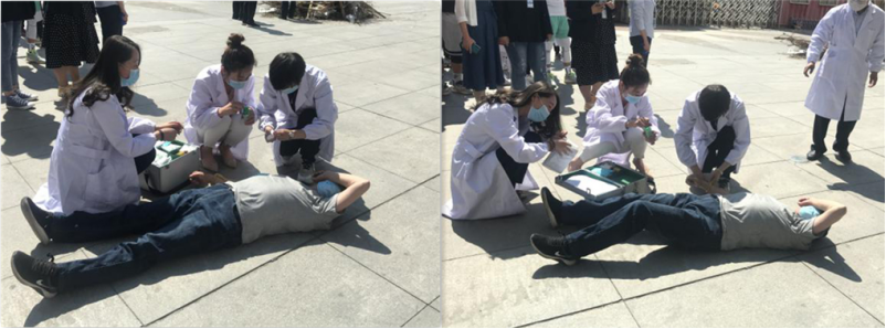 在模拟火灾救援现场中发现被困人员,由应急救援队将被困人员从火场中救出并带至安全区,由医疗救护组对伤员进行救治及转移。