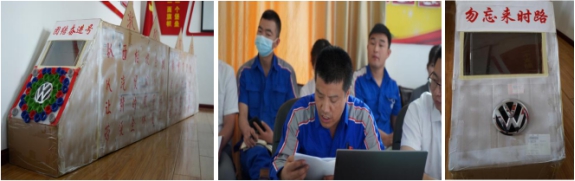 西柏坡精神是部生动的教科书,车间工人党员袁有德利用平时装配件的纸盒子,创意性地制做了一列"团结奋进号"火车,邀请党员一起乘车前行。袁有德说:"团结奋进号"列车蕴含着学习西柏坡精神,强企富家、团结奋进的寓意,车头前面的"大众"标识代表公司经营的品牌;八个绿色的大美孚机油盖代表八方来财,所有盖口都向外代表招揽客户,减少流失,而且像螺丝钉一样牢牢钉住!车头车尾标有"勿忘来时路"的字样,以此提醒广大党员干部不忘初心、牢记使命,一定不要忘记来时的路,回顾过去,展望未来,让"团结奋进"号列车在西柏坡精神的感召下前行。支部要求,在疫情防控和汽车行车严竣的形势下,我们每一个物产汽贸员工都是新时代的答卷者,让"团结奋进号"奔驰在新时代的征程上,承载着中国梦、物产梦,承载着物产汽贸职工群众对美好生活的向往,风驰电掣,勇往直前,奔向未来!